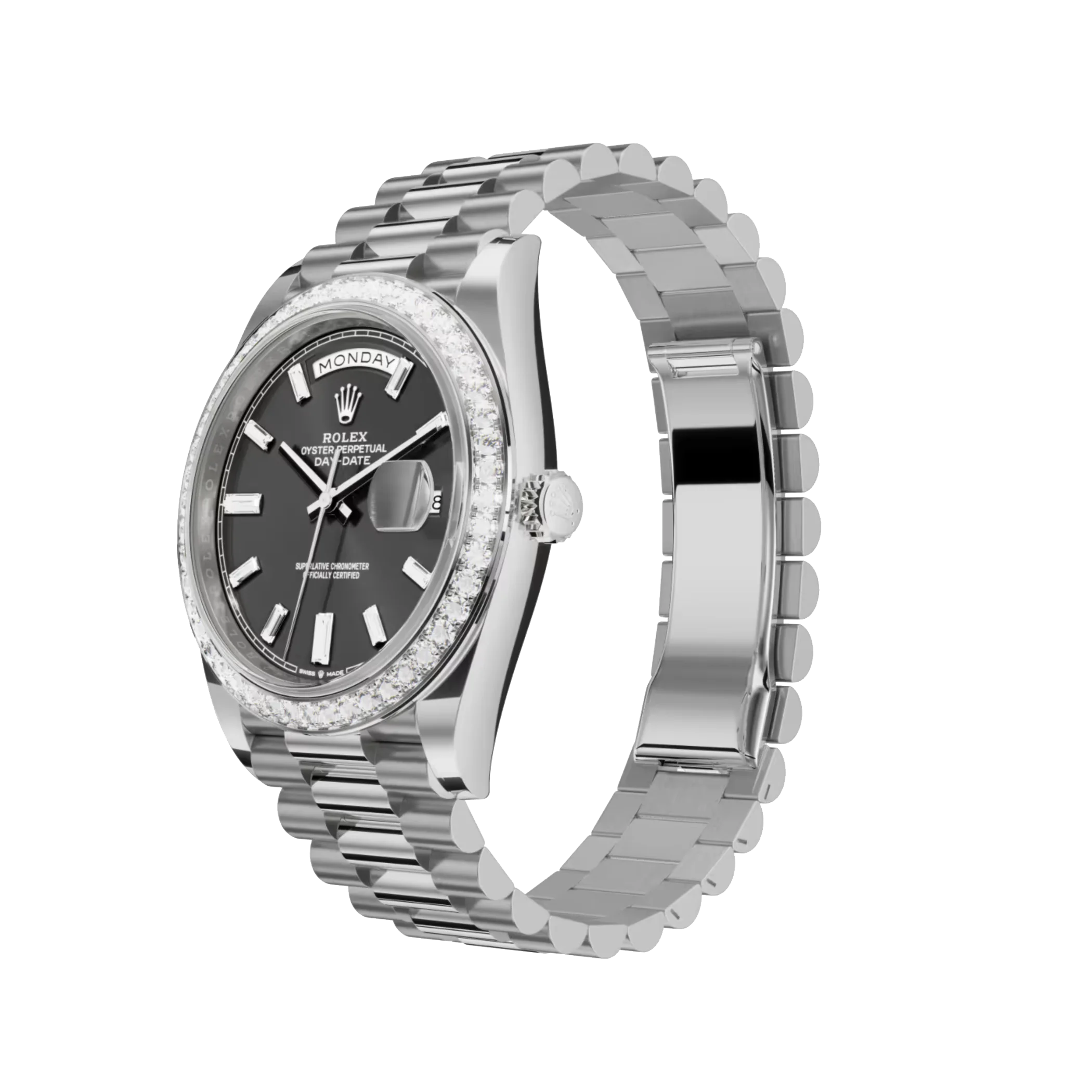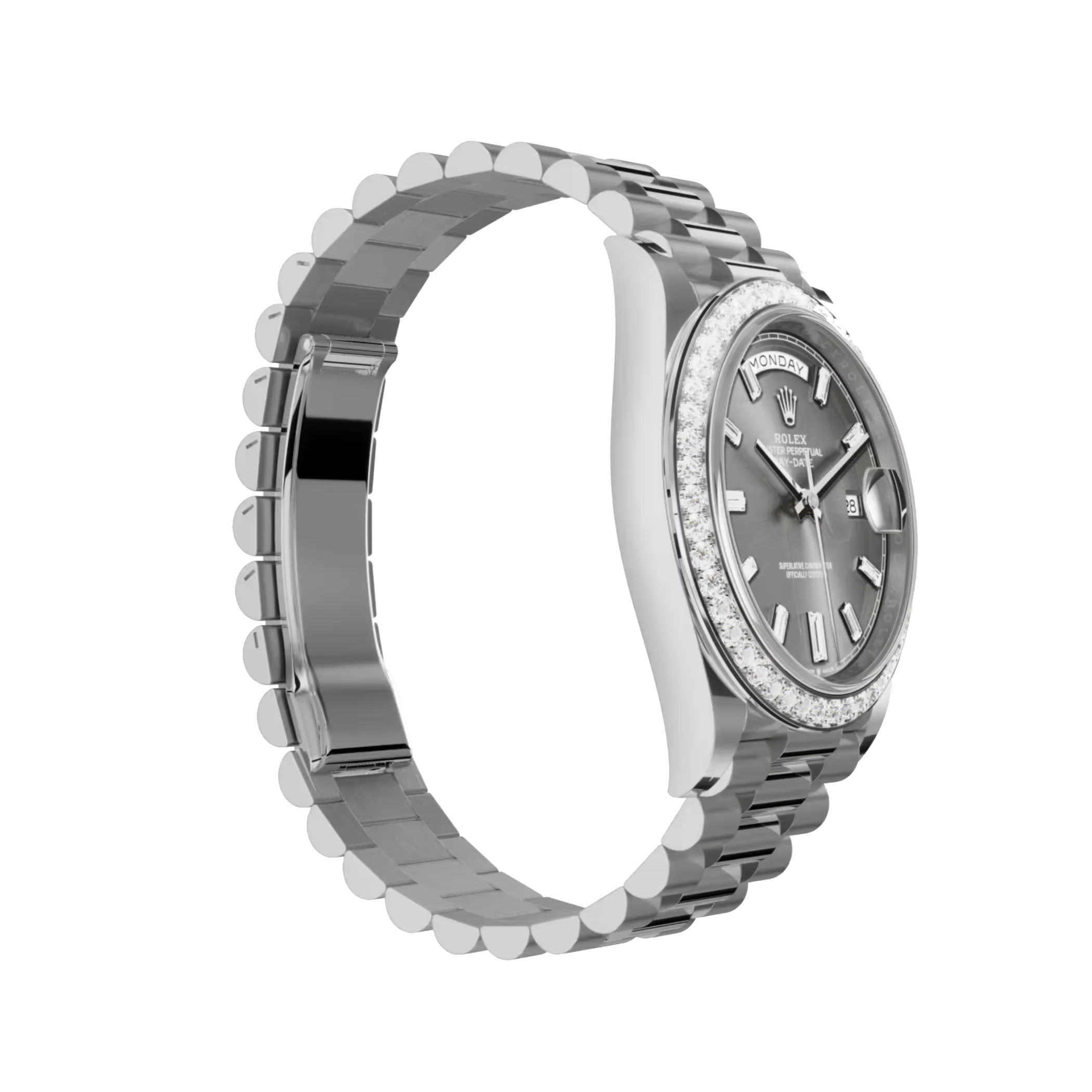 Advanced high technology is used in the creation, development, and manufacturing of Rolex bracelets and clasps, as well as in the rigorous testing that goes into them. Additionally, aesthetic controls by the human eye ensure flawless beauty, just like with all the watch’s components. In 1956, the semi-circular three-piece links of the President bracelet were designed for the debut of the Oyster Perpetual Day-Date. It is always constructed of carefully chosen precious metals and epitomizes comfort and refinement.
